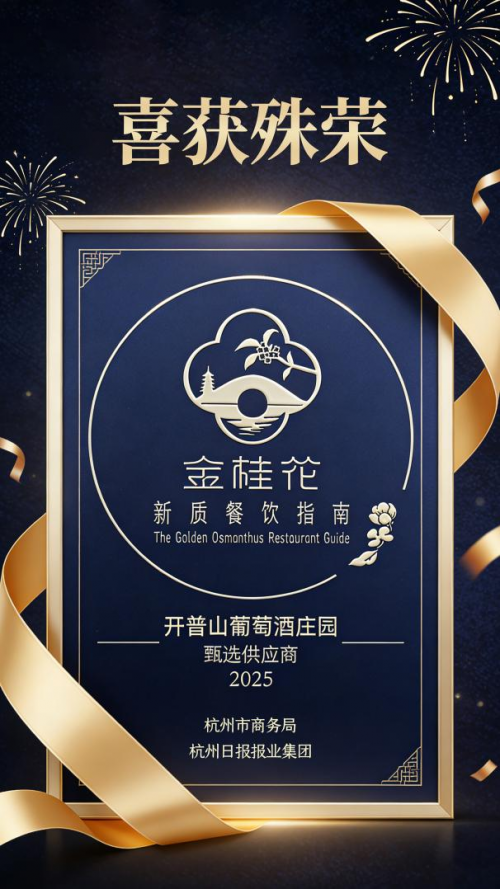 Gilbert & Gaillard国际盲品挑战赛的评鉴体系素来以严苛专业闻名业界,其奖项分量堪称葡萄酒领域的品质标杆,在全球范围内享有高度认可度与权威性。开普山此款品丽珠干红斩获双金奖与90分佳绩,无疑是其品质的硬核彰显,更是一次向世界展现卓越酿造实力的高光时刻。几乎同期落定的“金桂花新质餐饮指南”荣誉,则由杭州市商务局与杭州日报报业集团联合发起,聚焦餐饮市场真实消费场景,锚定本土化适配核心需求,是中国新质餐饮发展趋势的风向标之一。能够跻身这份权威名单,印证着南非开普山葡萄酒的独特风味逻辑,已然精准契合中国市场的味蕾审美与消费需求。这份跨越山海、贯通中西的双重认证,勾勒出开普山作为“国宴级”佳酿的立体模样,既有征服国际专业评委的经典底蕴,亦有融入东方宴饮日常的温润亲和力。